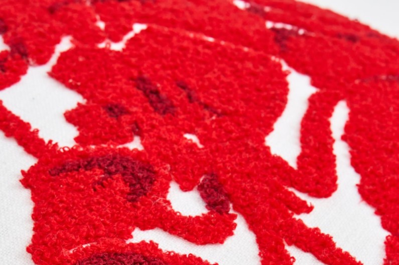 Coixí de cotó i ladana amb farciment independent i cremallera per rentar-lo. Hi ha imprès una llagosta de color vermell. Coixí d´alta qualitat.