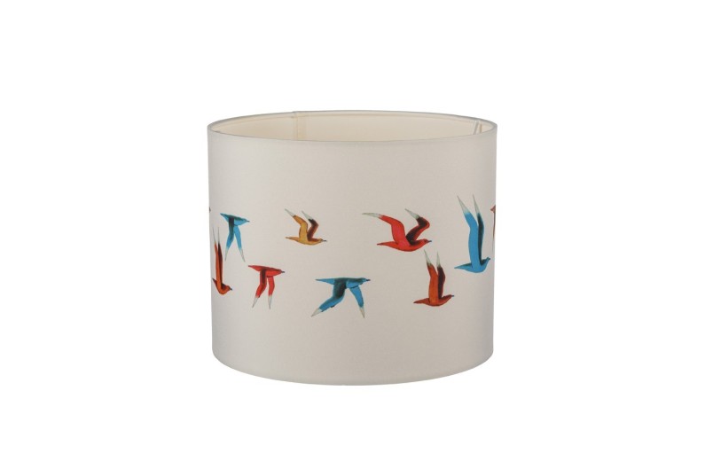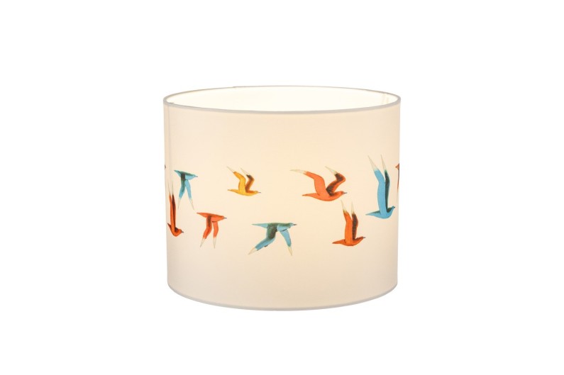Llum de sobretaula amb la base en forma de boia ia la pantalla amb dibuixos de gavines de diferents colors. Desprèn una bonica llum càlida. Base fabricada amb ciment i la pantalla de teixit.