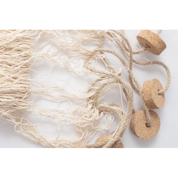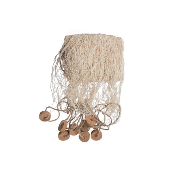 Xarxa de pescador en cotó. Els flotadors estan units a cada extrem per una corda de cànem. Objecte decoratiu que donarà un ambient marí.