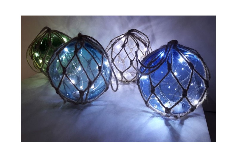 Set de 4 boies de pesca amb Led de diferents colors. La boia de pesca era un antic flotador constituït d'una bola de vidre envoltada d'una corda trenada. Es va utilitzar fins als anys 50 Aquests flotadors es fixaven en les xarxes de pesca perquè es mantinguessin en la superfície mentre derivaven pel corrent.