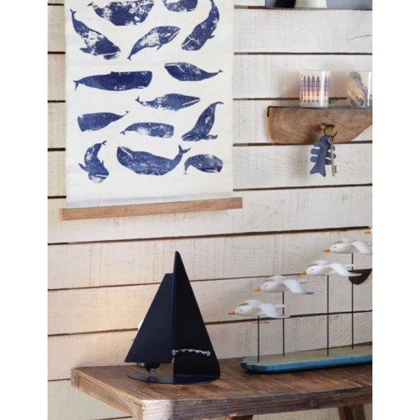 Làmpada metàl·lica en forma de veler, pintat en color blau. La seva llum projecta la imatge del veler. Bombeta E27.