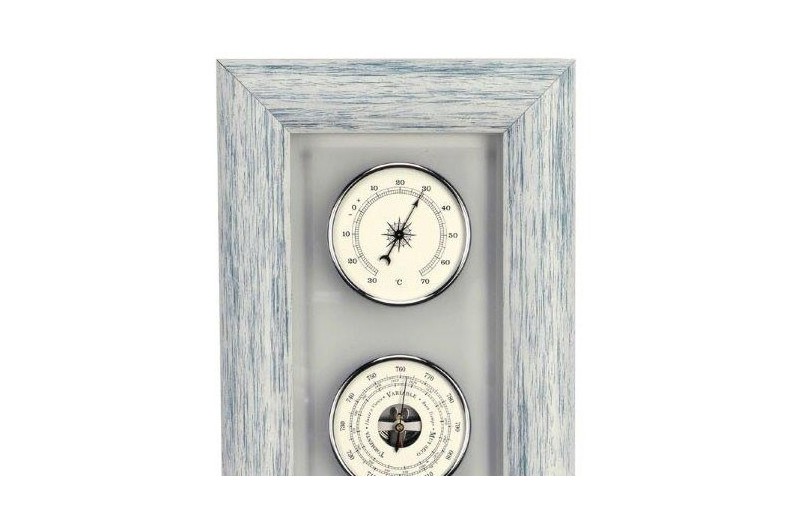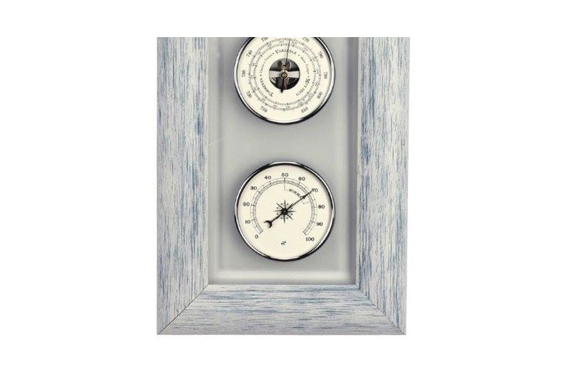 Estació meteorològica. Disposa de humitat, pressió atmosfèrica i la temperatura podent realitzar una previsió meteorològica bàsica de tot navegant. Estan muntats sobre un marc de fusta.