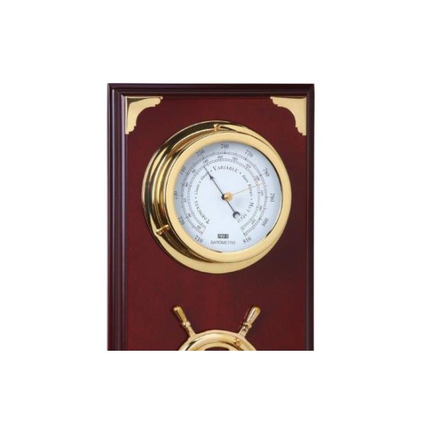 Baròmetre. Indica la pressió atmosfèrica. L'instrument de mesura és metàl·lic. Està muntat sobre una base de fusta. Ús preferent interior.