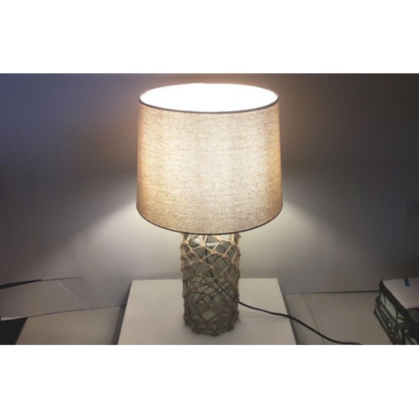 Làmpada decorativa en ampolla de vidre de color verd i pantalla de tela translúcida. Bombeta E27. Diàmetre ampolla: 14 cms Fotografies preses amb bombeta led de 4w i 2700K