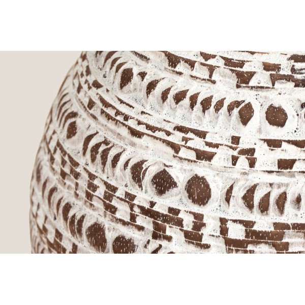 Llum de taula de fusta d'albàsia, marró i blanc, decorada amb sanefes, amb pantalla de fibra tèxtil. Fabricat artesanalment a Indonèsia.