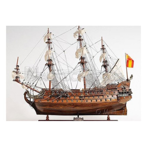 un disseny elegant. Era la nau principal de l'Armada Espanyola que va lluitar contra els britànics i els francesos. En 1744 va ser danyada durant un enfrontament amb els navilis britànics i remolcat a Cartagena. Maqueta decorativa amb acabats d'una gran qualitat realitzada en fusta, envernissada i completament muntada de forma artesanal.Embalaje en caixa individual.Detalls del producte
