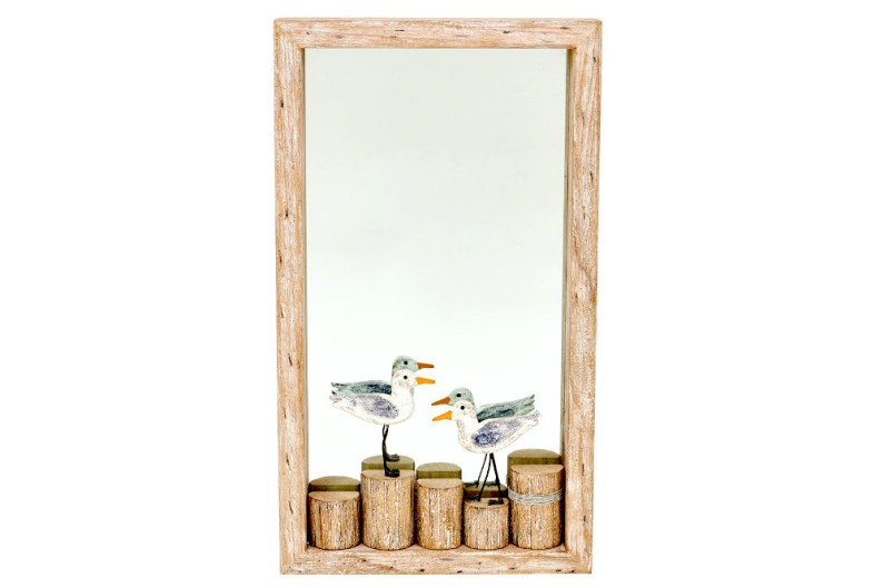 Mirall amb marc de fusta natural, fabricat a mà, amb un bonic ocell integrat en el mirall.