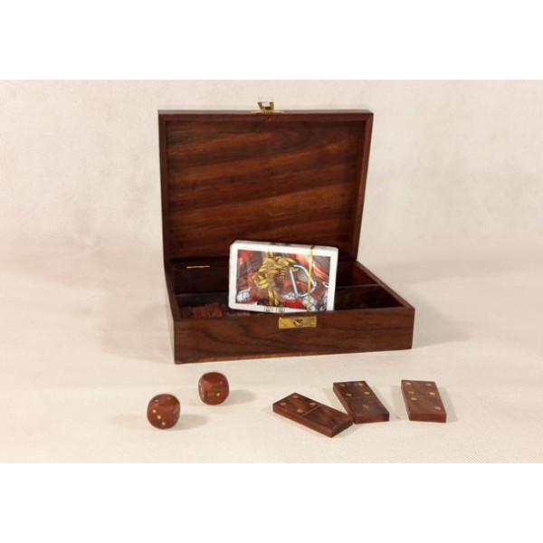 Excel·lent set del joc cartes, dòmino i daus en caixa de fusta decorada en llautó. Excel·lent regal per passar una bona estona.