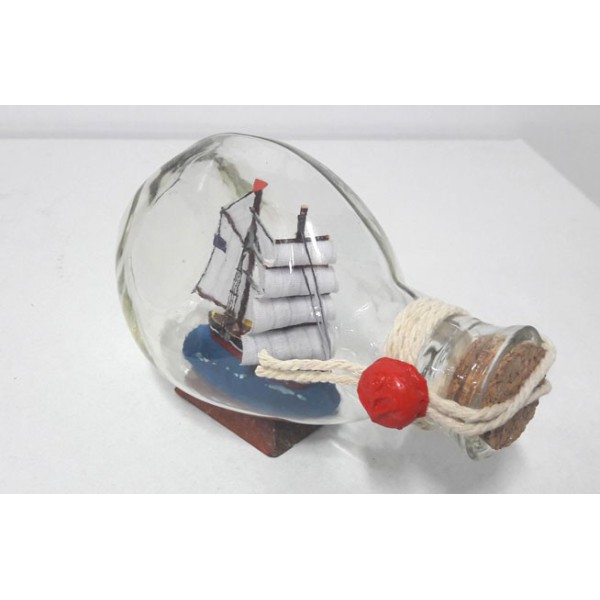 Vaixell en ampolla de 13,5cm de longitud tallats en fusta de qualitat, pintats i segellat amb cera. Ideal com a recordatori de convencions o visites, o com a detall per a nens.