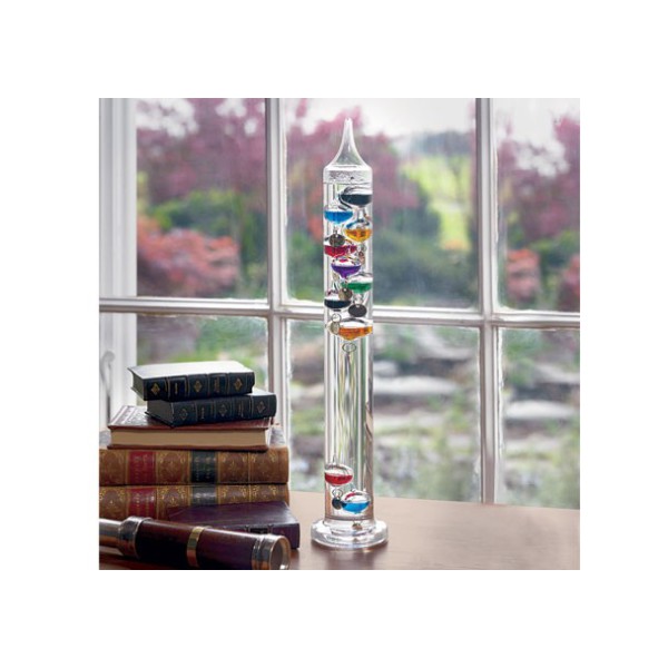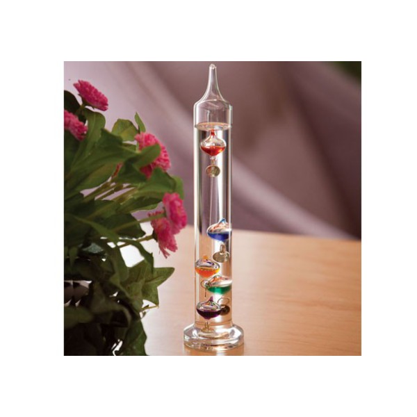 Basat en un termoscopi fabricat per Galileo Galilei a principis del s. XVII. Termòmetre bastant precís i molt senzill, actualment s’utilitza bàsicament com a decoració. El termòmetre Galileo consisteix en un tub de vidre segellat que s’omple d’aigua destil·lada i diverses bombolles flotants. Les bombolles es formen com esferes de vidre que s’omplen amb una barreja líquida de colors. Aquesta barreja líquida conté alcohol, o pot ser simplement aigua amb colorants alimentaris.