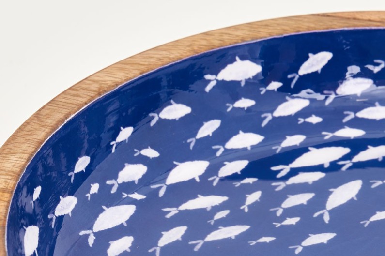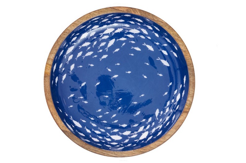 Schale aus Bambusholz und innen emailliert mit aufgedrucktem Fisch.