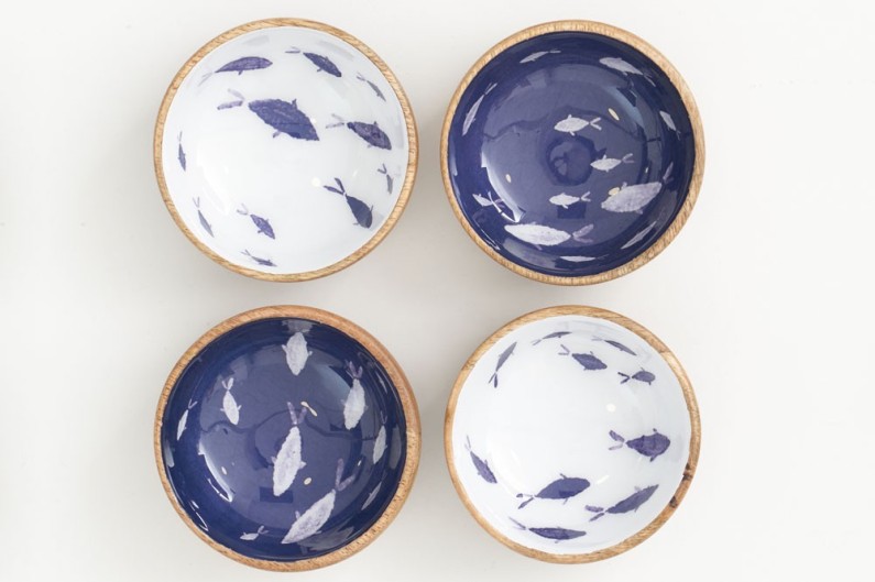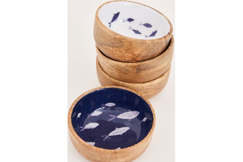 Set mit 4 kleinen Schüsseln aus hochwertigem Holz und innen emailliert. Ideal für Snacks.
