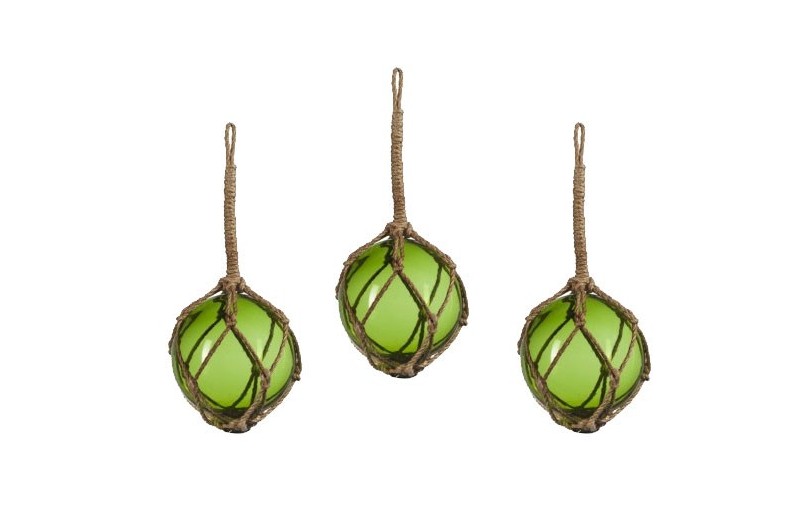 Set von 3 Fischerbojen. Die Fischer-Boje war ein alter Schwimmer bestehend aus einer Glaskugel in einem geflochtenen Seil gewickelt. Diese Schwimmer wurden bis in die 50er Jahre verwendet . Sie wurden an die Fischernetze festgemacht damit sie an der Oberfläche blieben während sie vom Strom getrieben wurden. Ein Objekt, das ein dekorativer Meeres-Touch gibt.