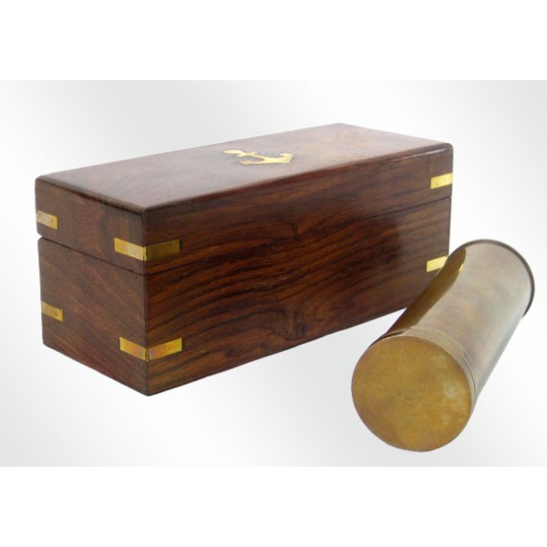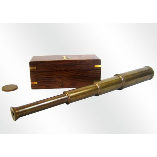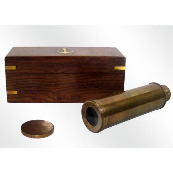Schöne Replik eines alten Fernrohrs, aus Bronze, mit einer besonderen Behandlung. Kommt in einer Holzkiste , auf der Innenseite ausgekleidet, mit einem Anker dekoriert. Der erweiterte Fernglas ist 38 cm lang. Funktioniert perfekt, aber seine Verwendung sollte rein dekorativ sein.