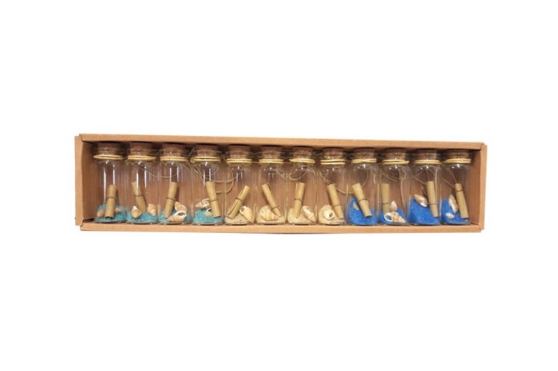 Set mit 12 Glasflaschen mit Sand, Muscheln und Pergament.
