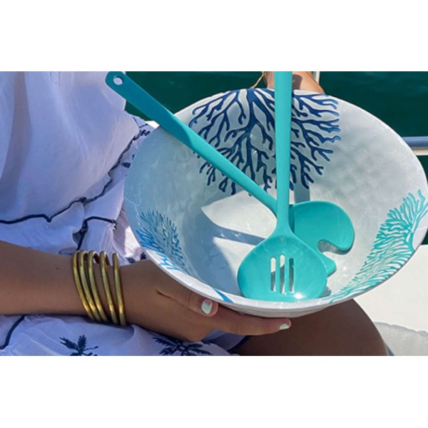 Salatschüssel mit Besteck. Hergestellt aus hochdichtem Melamin, spülmaschinengeeignet und sturzsicher.