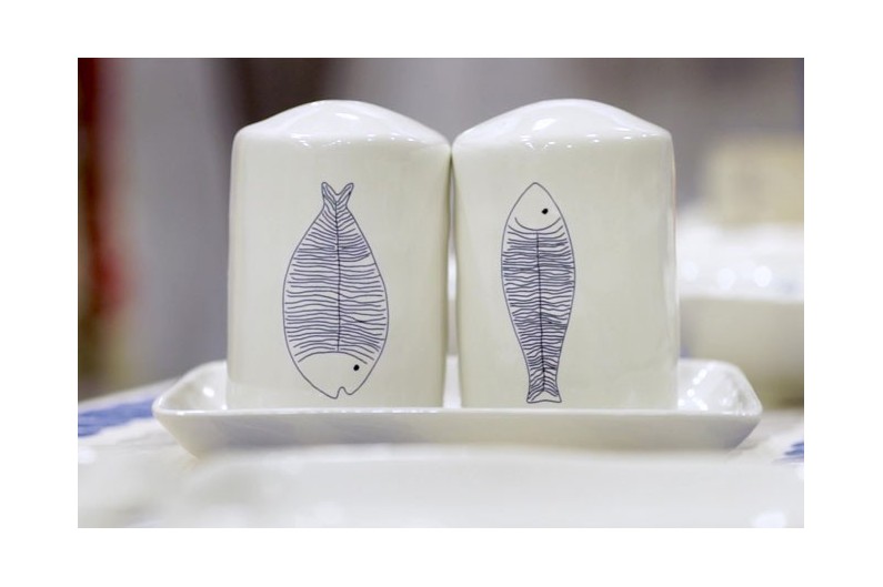 Keramische Salzstreuer und Pfefferstreuer mit Fisch. Geeignet für Geschirrspüler und Mikrowelle.