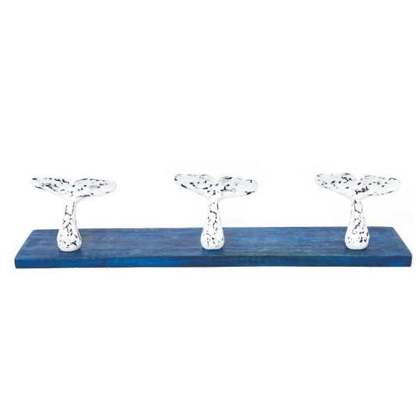Fischschwanzförmiger Kleiderbügel in leuchtenden Farben mit drei Metallbügeln , zum Aufhängen von Taschen, Mänteln und allem, was Sie wollen. Aus Holz und von Hand bemalt