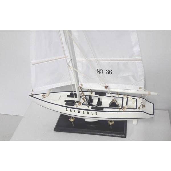 Reproduktion eines Regatta-Segelboots, erhältlich in zwei Farben, weiß und blau / rot. Messen Sie das Regal oder Platz, wo Sie , dieses schöne Modell setzen wollen, da diese Modelle größer sind , als sie erscheinen.