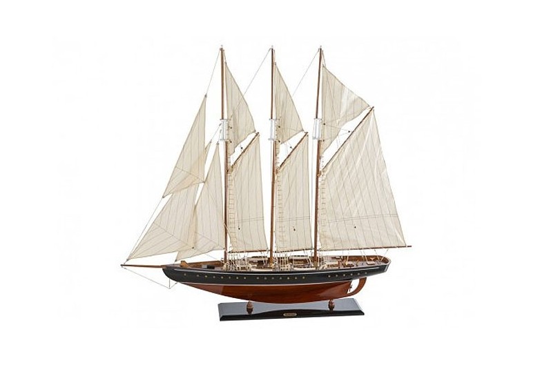 Modellschiff Atlantic (1903), ein Drei-Schoner entworfen von William Gardner. Wurde letztendlich ein Schulschiff für die US-Küstenwache. Das Model list von Hand hergestellt und bemalt. Der Mast ist für den Transport zerlegt.