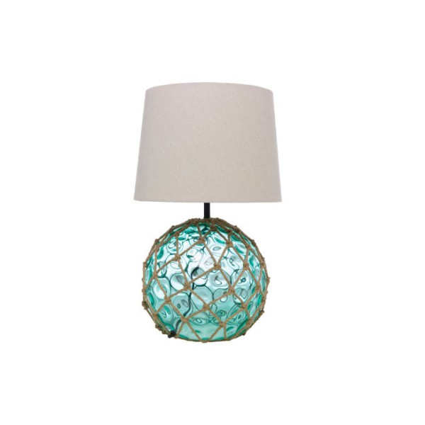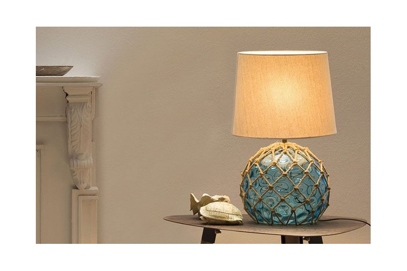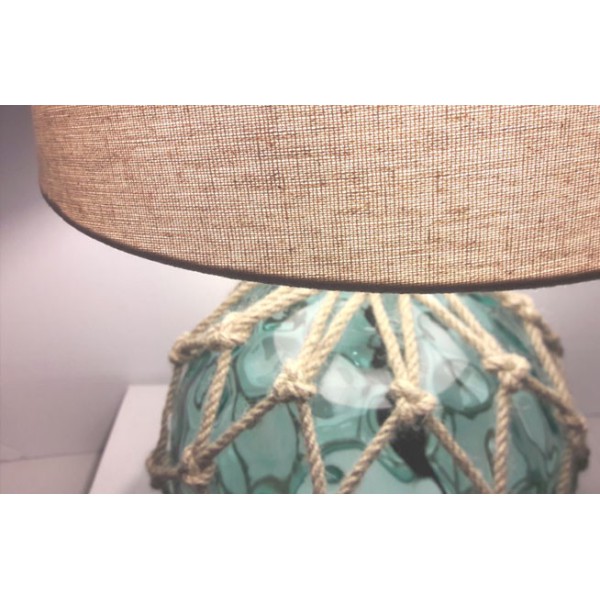 Tischlampe aus Glasbojen mit Lampenschirm aus durchscheinend Stoff.