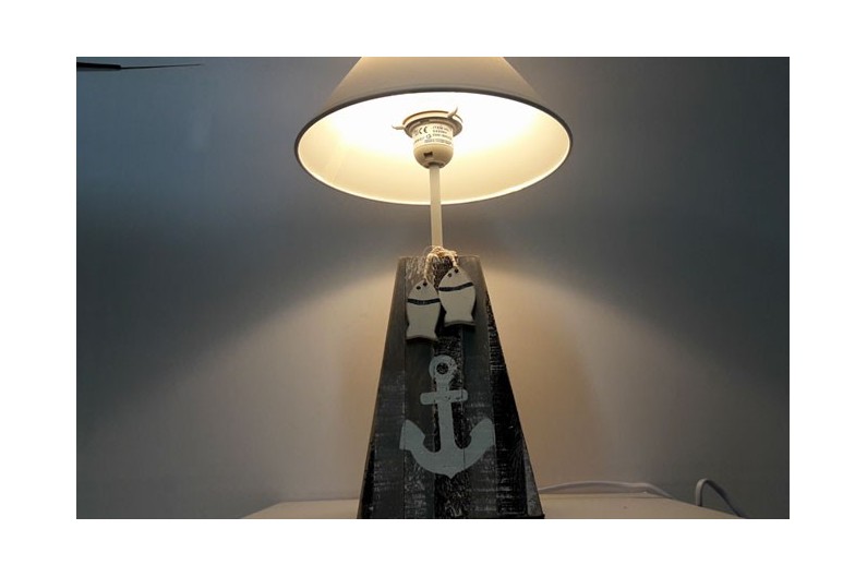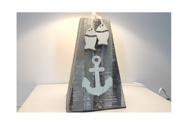 Dekorative Seelampe aus Holz, bemalt und mit einem Schiffsanker verziert.