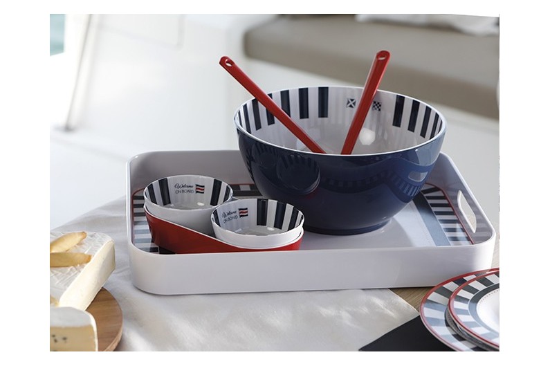 Rechteckiges Tablett mit schönem Design, mit weißem Hintergrund und blauen und roten Streifen.