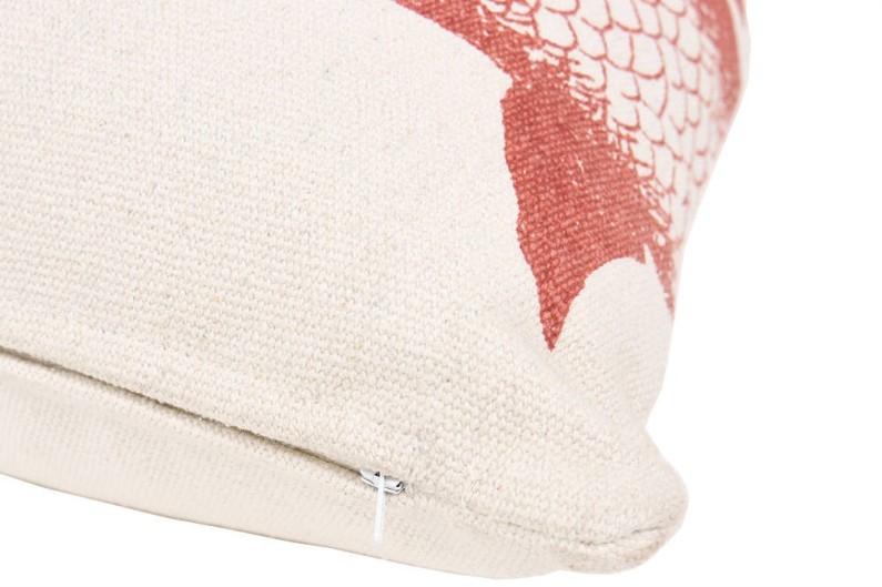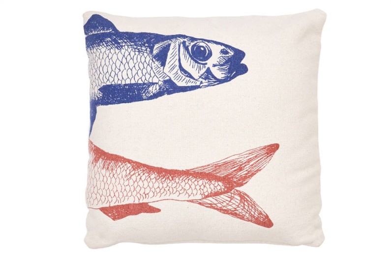 Set of 2 cotton cushions, with printed fish, high quality, white background.