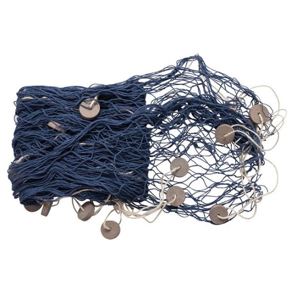 Cotton fishing net edged with floats attached with hemp rope. For a decorative marine touch.