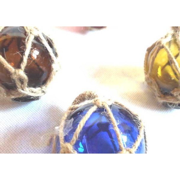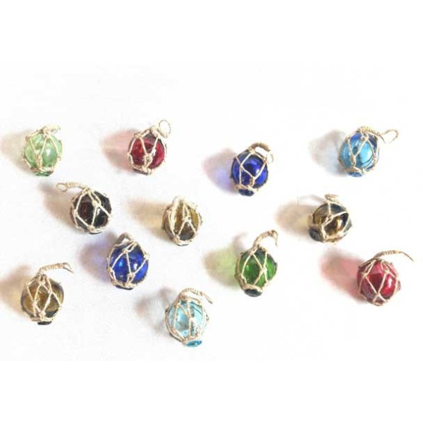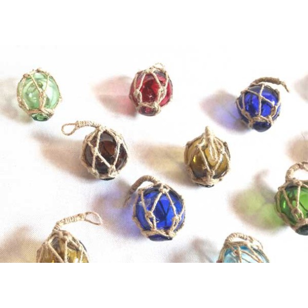 Assortment of 12 colored buoys. Glass balls in braided hemp net. Until the 1950s fishermen attached these to their nets to keep them afloat while they drifted with the current. Lends a decorative marine touch.