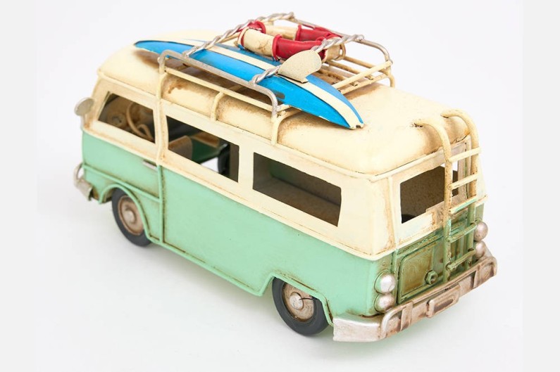 Beautiful model of an old van from the 70s, the typical 'Volkswagen' type van, with the surfboard, ready to go to the beach.