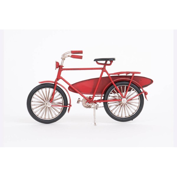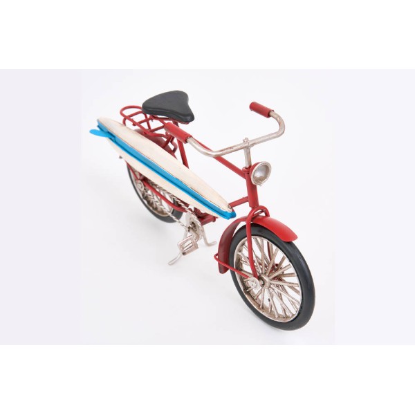 Figure of a beautiful bicycle from the 70s with a surfboard, ready to go to the beach.