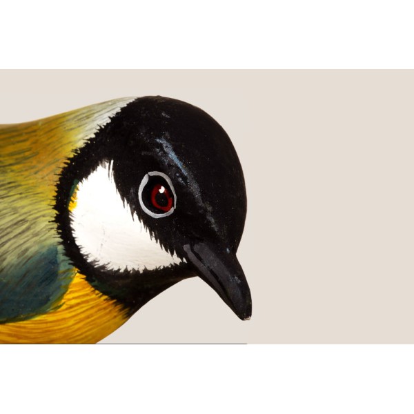 Albasia wood bird, of the "great tit" species, with a wooden trunk stand. Handcrafted in Indonesia, unique piece.