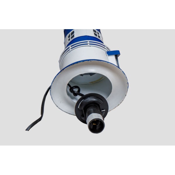 Blue and white striped metal lighthouse with light. The lighthouse socket (E14) is located under the lighthouse. This lighthouse is designed for indoor use and runs on 220v electricity. The cable length is 1.5 m and it has a switch to turn on the lighthouse light.