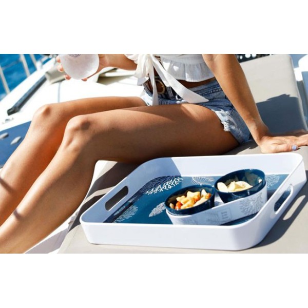 Rectangular tray with lovely design, blue-colored background.