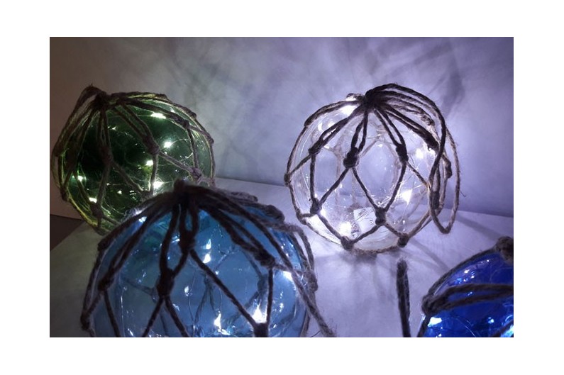 Set of 4 fishing buoys with LED of different colors. Until the 1950s fishermen attached these to their nets to keep them afloat while they drifted with the current. Lends a decorative marine touch.