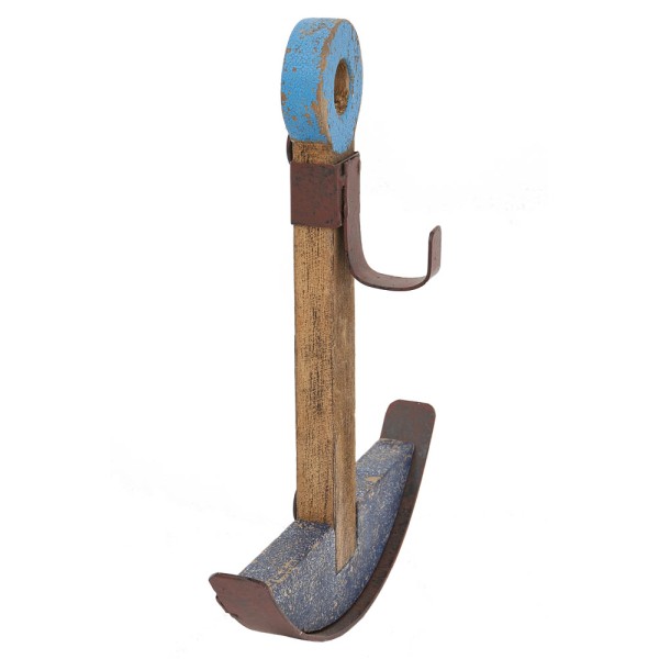 Hanger with wooden base and steel hanger, shaped like an anchor.