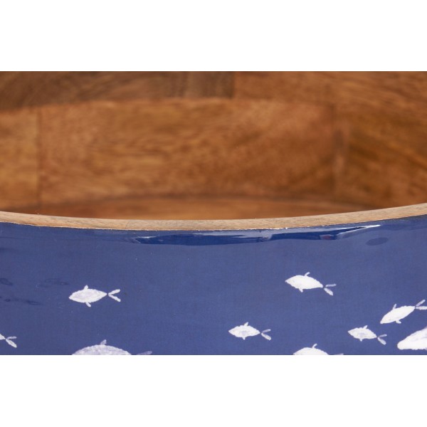 Bowl made of bamboo wood and enameled inside with fishes printed.