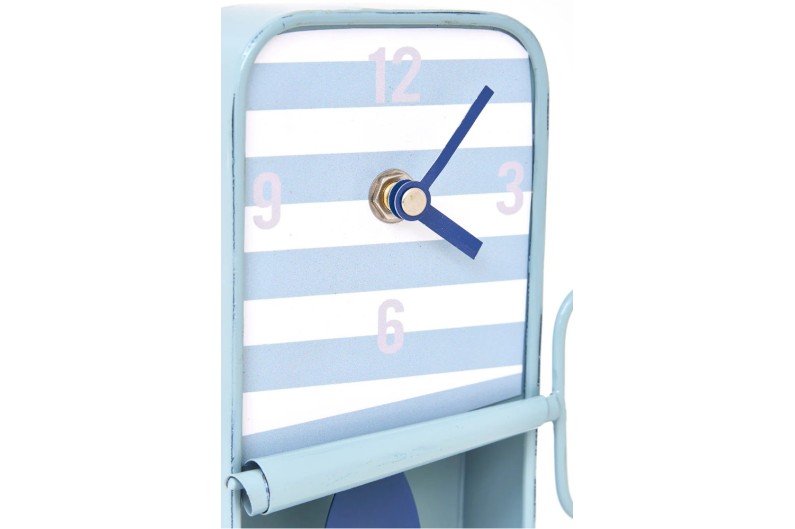 A clock shaped like a tin can. The front has a blue striped design and a semi-open finish. Inside is a blue fishtail pendulum, visible as a decorative element.