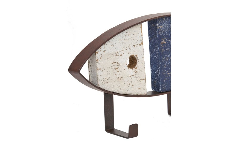 Colgador con forma de pez, fabricado en madera y metal. Puede colgarlo con tornillos o adeshivo de montaje.