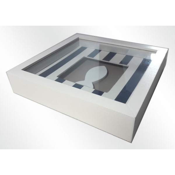 Cuadro marino decorativo en madera azul. En él se destaca un bonito pez.