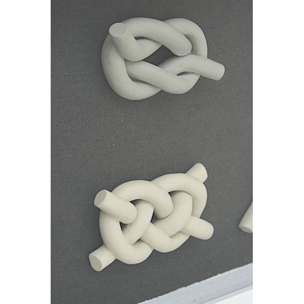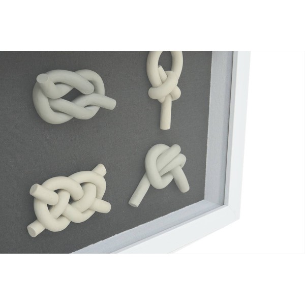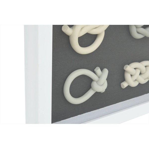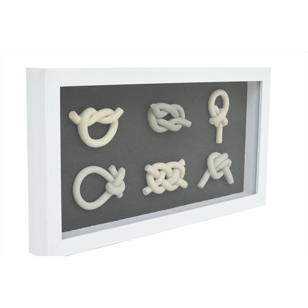 Prestigioso cuadro marinero. Con un fondo de color negro, existen varios nudos marineros expuestos. Marco de madera maciza y pintada en blanco. Cada uno de los nudos está realizado tradicionalmente siguiendo las tradiciones marineras.