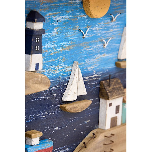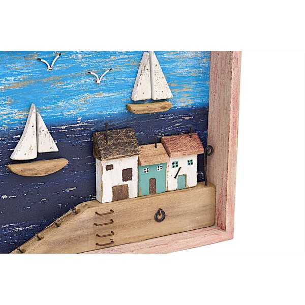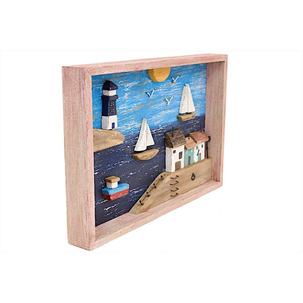 Cuadro marino decorativo en madera. En él se destaca un hermoso paisaje marinero.