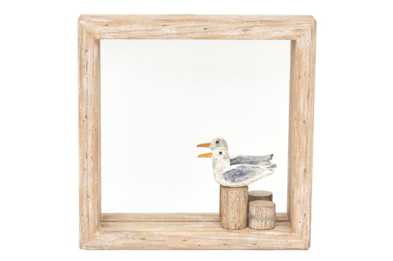 Espejo con marco de madera natural, fabricado a mano, con un bonito pájaro integrado en el espejo.