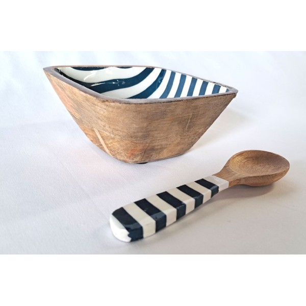 Cuenco fabricado en madera esmaltada a rayas con cuchara.