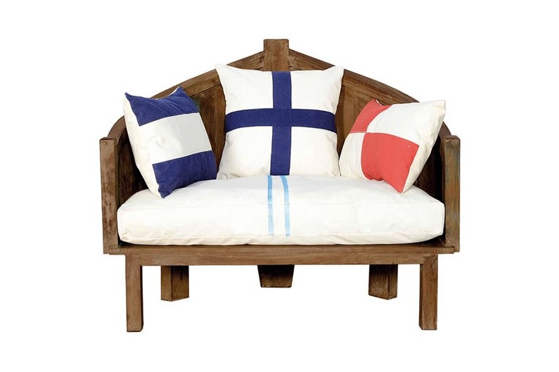 Butaca con forma de proa de barco. Fabricada en madera envejecida. Incluye set de cojines.