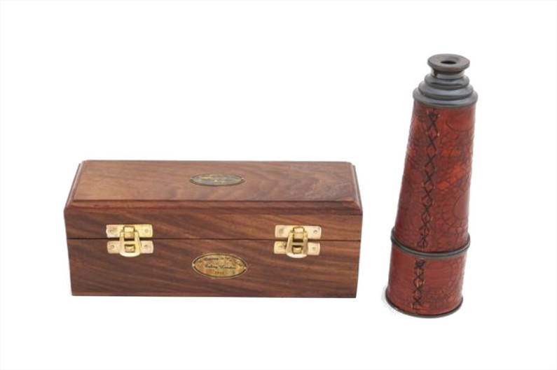 Preciosa réplica de un catalejo antiguo, fabricado en bronce, con tratamiento especial. Incluye caja de madera forrada en el interior, con inscripción de ancla. Una vez extendido el catalejo tiene una longitud de 59 cm. Funciona perfectamente pero su uso debe ser exclusivamente decorativo.