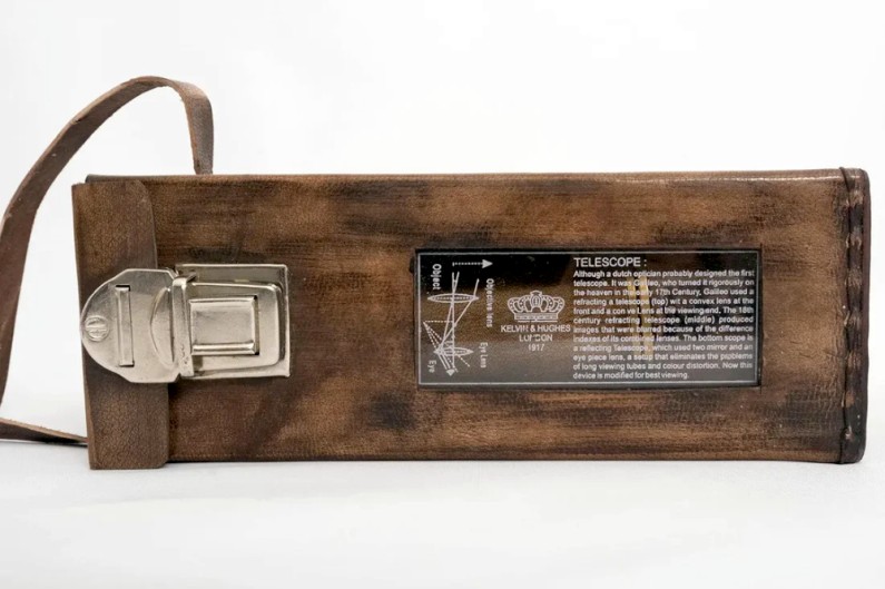 Preciosa réplica de un catalejo antiguo, fabricado en bronce, latón y cuero, con tratamiento especial. Incluye caja de cuero, con inscripción. Una vez extendido el catalejo tiene una longitud de 59 cm. Funciona perfectamente pero su uso debe ser exclusivamente decorativo.
