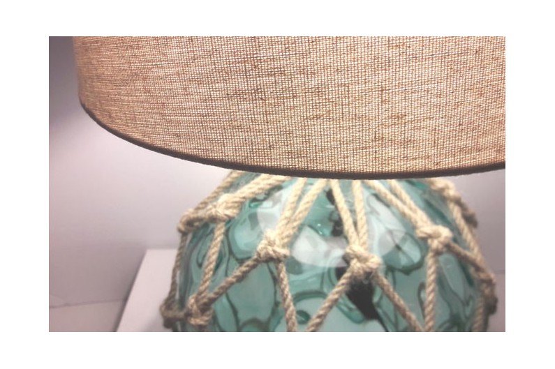 Lámpara de boya de cristal de sobremesa con pantalla de tela translúcida.