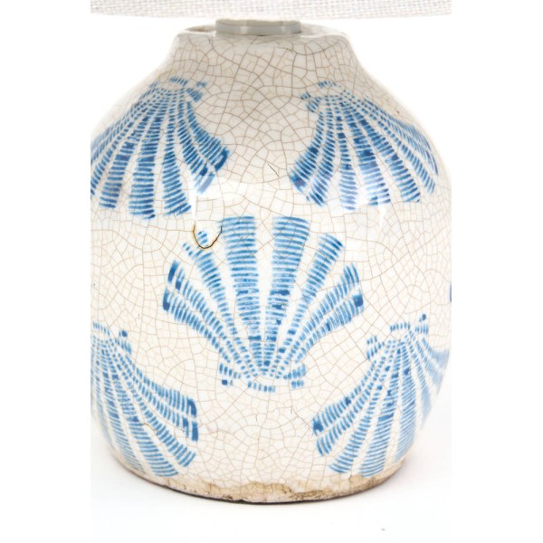 Lámpara de terracota de color blanco, con conchas de color azul impresas, de sobremesa con pantalla de tela translúcida.